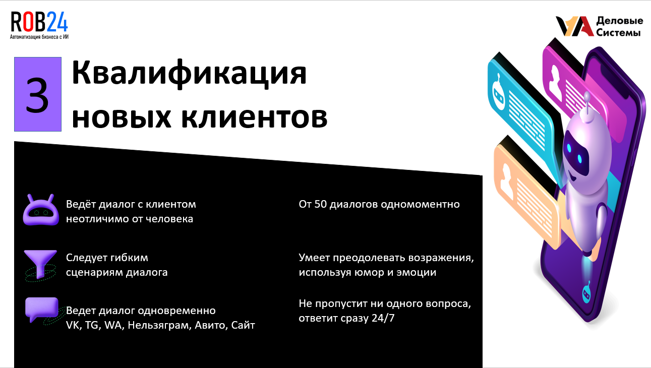 Расскажет как чат-бот с ИИ может заменить менеджера по продажам, как ИИ может снять нагрузку с менеджера по продажам, как ИИ может фильтровать кандидатов.